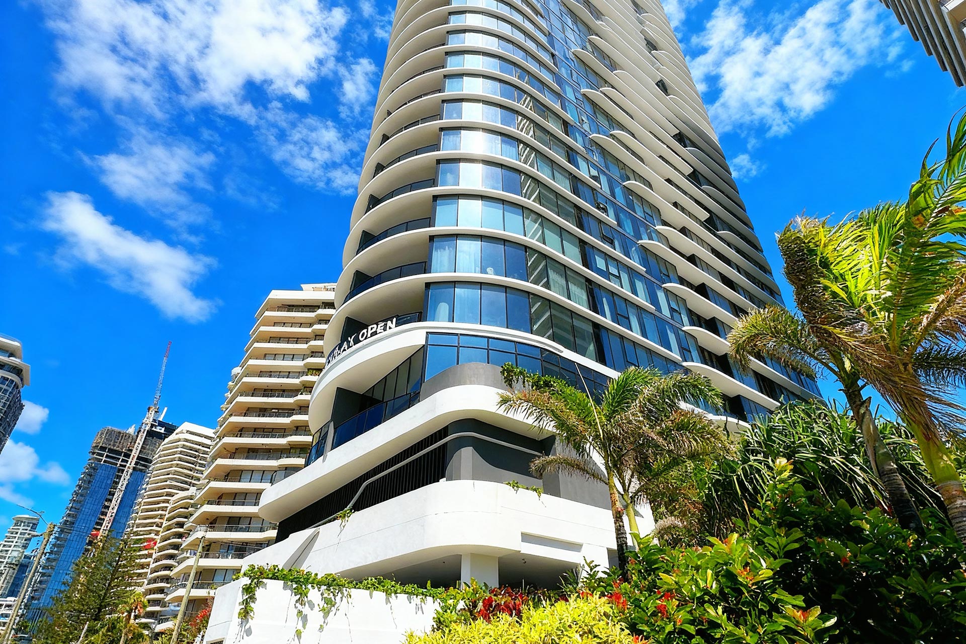 A luxury apartment tower in Broadbeach with an impressive entrance and rooftop area.